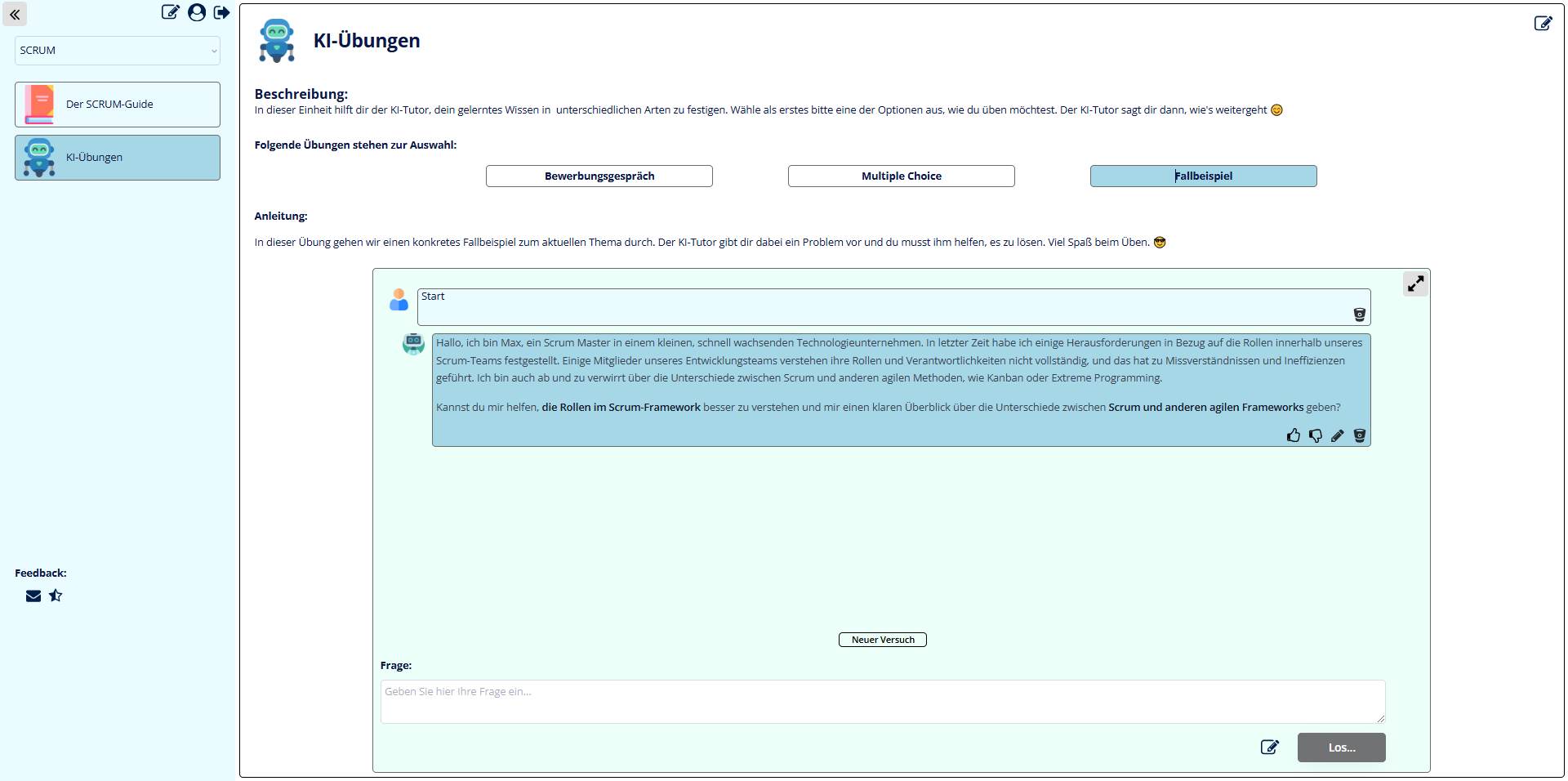 * **Feedbacksystem:** Nutzer:innen können die Qualität der KI-Antworten sowie der bereitgestellten Lerninhalte bewerten – eine wichtige Grundlage für Optimierung und Qualitätssicherung.